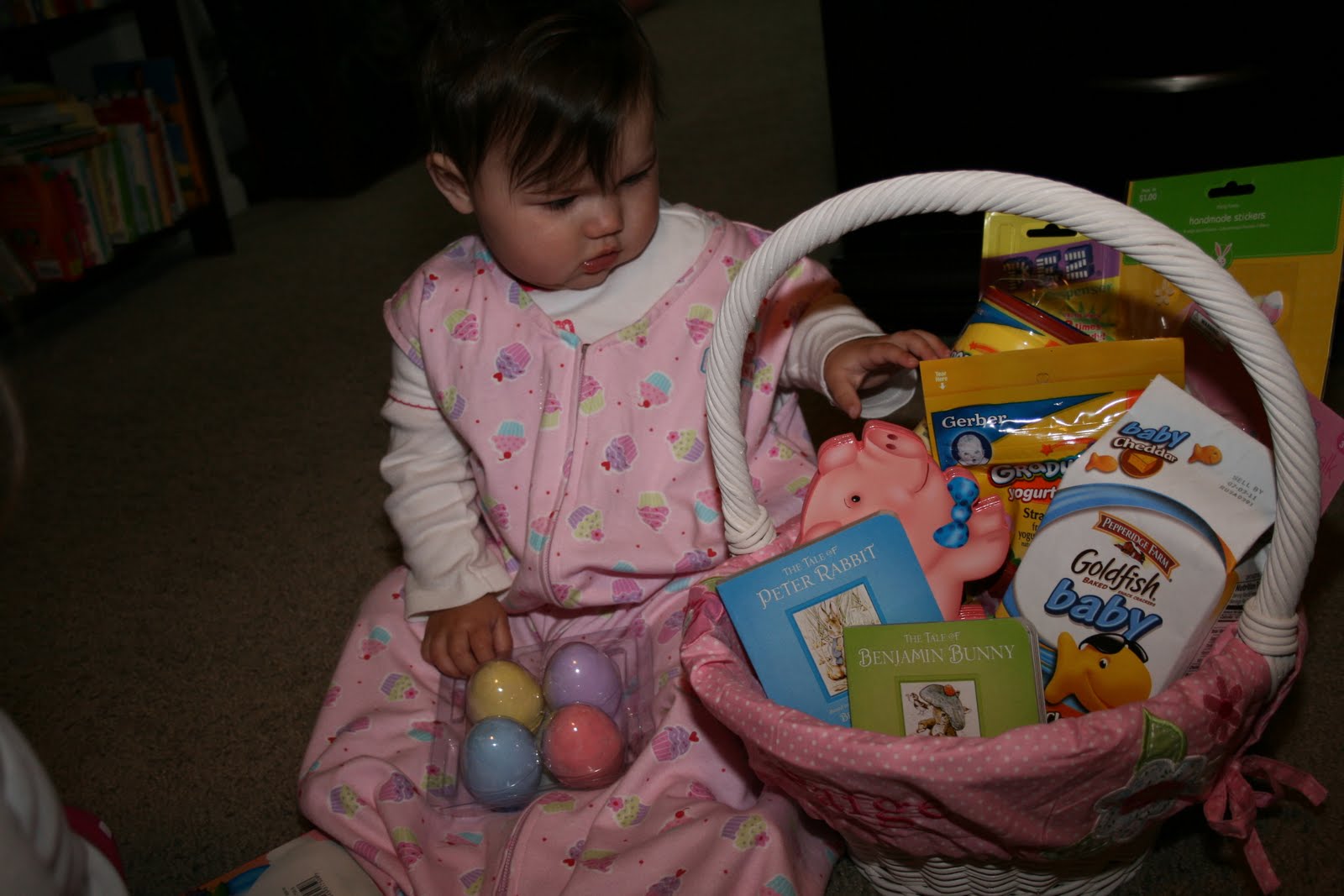 Last night, Allie was so excited for the Easter Bunny to come. She kept looking out the front window for bunny tracks and every little sound she heard, she was sure it was him. Once she finally got settled and ready for bed, she said "I just know the Easter Bunny will leave and egg under my pillow"....he must have been listening because this morning there was an egg under her pillow and in Paigee's crib ;o) Allie woke up at the crack of dawn and was soooo excited. She said "Easter is here...Easter is here...yay!" After convincing her to stay in bed for a "few more minutes" we finally went downstairs and she found the baskets. The bunny left one for Allie and Paige! The Easter Bunny tried not to put too much candy in the baskets this year, but Allie has been saying that she wants a HUGE chocolate bunny in her basket. Well Mr. EB pulled through and she got a princess chocolate bunny. She hugged it and said "this is what I wanted my whole life, I knew he would bring me one!" Once Paige woke up, Allie helped her find her goodies in her basket. Paige loved taking the things out of her basket and reading her new books. It was a Happy Easter morning!